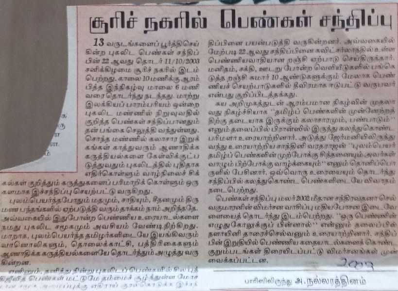 புகலிடத்தில் வாழும் பெண்கள் தங்கள் கருத்துக்களையும் அனுபவங்களையும் பா¢மாறிக்கொள்ளும் முகமாக 1990இல் ஜெர்மனியில் உள்ள சில பெண்களால் ஆரம்பிக்கப்பட்டது. இப் பெண்கள் சந்திப்பு ஜெர்மனியின் பல்வேறு மாநிலங்களில் தொடர்ந்து நடைபெற்று வருகின்ற அதேநேரம், அது தனது எல்லைகளை விஸ்தரித்து சுவிஸ், பிரான்ஸ் போன்ற நாடுகளிலும் சந்திப்புகளை நடாத்தி வருகின்றது. ஜரோப்பாவில் வாழும் பெண்கள் மட்டுமன்றி இலங்கைஇ இந்தியா அவுஸ்திரேலியாவிலிருந்தும்கூட பெண்கள் வந்து கலந்து கொள்ளும் சந்திப்பாக வளர்ந்திருக்கிறது. சுவிஸில் மூன்றாவது தடவையாக நடைபெறும் பெண்கள் சந்திப்பின் 22வது தொடர் ஒக்டோபர் மாதம் 11ம் திகத§ சுவிஸ் சூரிச்சில் நகா¢ல் நடைபெற்றது. இச் சந்திப்பு தனது 13வது வருடத்தை பூர்த்தி செய்வதும் இங்கு குறிப்பிடத்தக்கது. ஓரு நாள் நிகழ்ச்சியாக நடைபெற்ற இச் சந்திப்பில் பெண்ணியச் சிந்தனை நோக்கிலான கருத்தாடல்கள்இ அனுபவப் பகிர்வுகள்இ விமர்சனங்கள் என்பன இடம்பெற்றன.