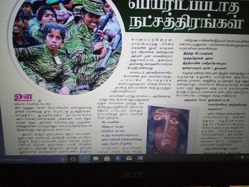 2009ஆம் ஆண்டு ஆயுதப்போராட்டம் மழுங்கடக்கப்பட்ட பின்னர், அங்கிருந்த போராளிகள் தற்போது உயிரோடில்லை. ஆயினும் அவர்தம் உணர்வுகளைப் பதிவிடத்துணிந்த ஊடறு மதிப்புக்குரியதாகின்றது. தினமும் க்ஷெல்லுக்குள்ளும் விமானக்குண்டு வீச்சுக்குள்ளும் மரணங்களுக்குள்ளும் வாழ்ந்திட்ட போதும் தம் வாழ்வில் வசந்தமொன்றைக் கற்பனை செய்தவாறு காலங்களைக் கடத்திய அவர்தம் வாழ்வு மிகப்பெரும் சோகமொன்றை விதைத்து விடுகின்றது. சாக விரும்பாது பலரும் நாளைய பொழுதும் தாம் வாழ வேண்டுமென விரும்புகின்றனர். நிச்சயமற்ற வாழ்வோடு நாளும் வாழ்கின்ற நிலைப்பாட்டினால் ஆழ்மனத்து ஏக்கமாகக் கவிதைகளில் அவற்றை வெளிப்படுகின்றனர்.