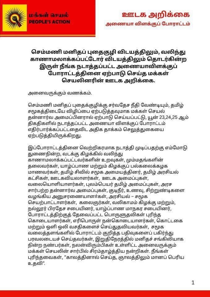 செம்மணி மனிதப் புதைகுழி விடயத்திலும், வலிந்து காணாமலாக்கப்பட்டோர் விடயத்திலும் தொடர்கின்ற இருள் நீங்க நடாத்தப்பட்ட அணையாவிளக்குப் போராட்டத்தினை ஏற்பாடு செய்த மக்கள் செயலினரின் ஊடக அறிக்கை.